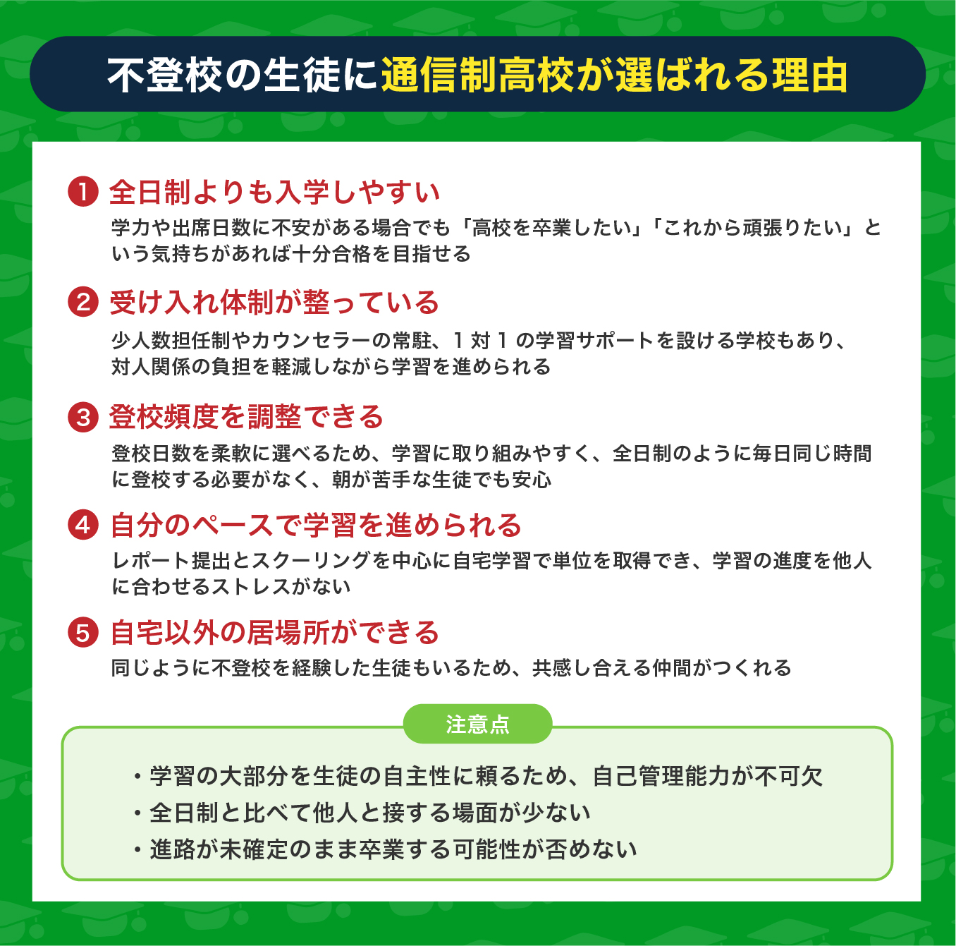 不登校の生徒に通信制高校が選ばれる理由として、以下の5つが挙げられます。