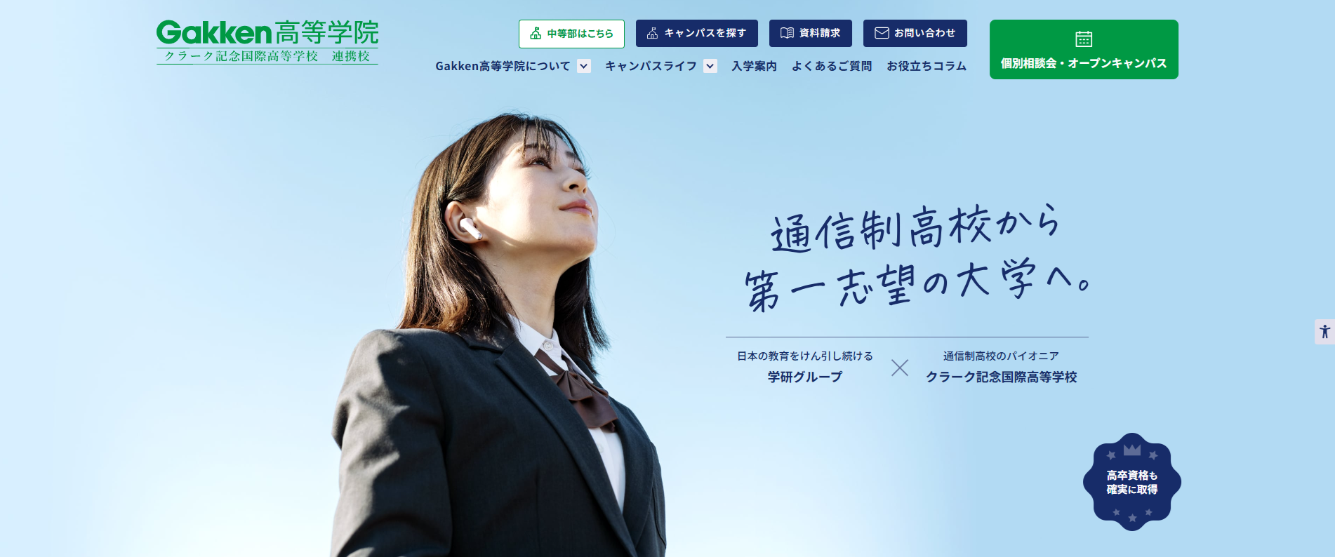 学研グループとクラーク記念国際高等学校の総力を結集して設立した、通信制高校連携校です。コーチング担任制をとっており、一人ひとりの学習状況や困りごとに向き合うことで高校生活をサポートしています。単位修得や大学受験など、個々の目標に合わせて学習計画を立てられます。