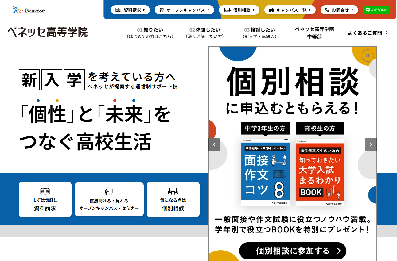 「 進研ゼミ」や「進研模試」 で多くの高校生をサポートしてきたベネッセから生まれた通信制サポート校です。クラス担任と赤ペンメンターの二重サポート体制により、学習や卒業後の進路相談など気軽に相談できる体制が整っています。教科別の指導や進路指導などの教育のプロはもちろん、カウンセラーも在籍しており、学習面に加えて心理のプロのサポートも万全です。