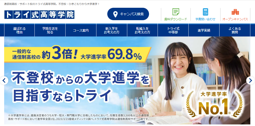 120万人の指導実績を誇る家庭教師のトライのノウハウから生まれた通信制高校です。完全マンツーマン指導が特徴で、大学進学率69.7%の実績があります。高校卒業率は99%で、一人ひとりの夢や目標の実現を決して諦めない学習指導を行っています。