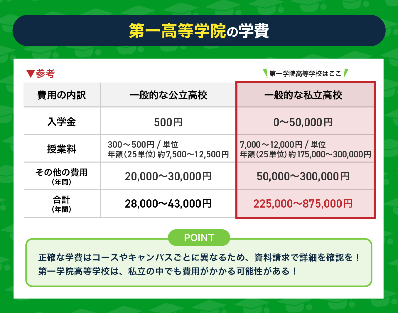 このように、公立と私立では費用に大きな差があります。第一学院高等学校は、私立の中でも費用がかかる可能性がある点は留意しておきましょう。