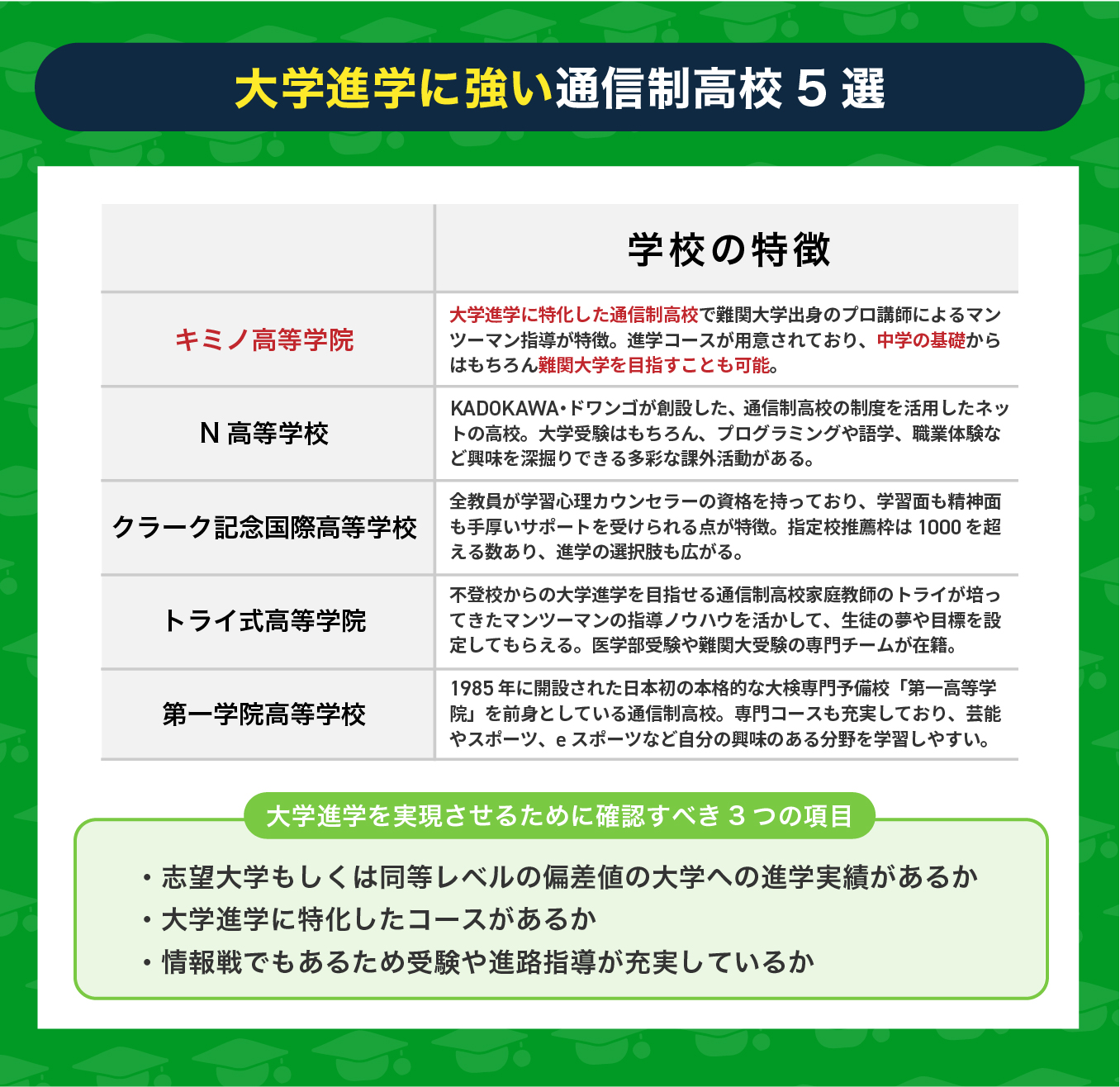 通信制高校に入学後、大学進学を目指すためには学校選びが重要です。ここでは、通信制高校を選ぶ際に確認すべき3つの項目を解説します。