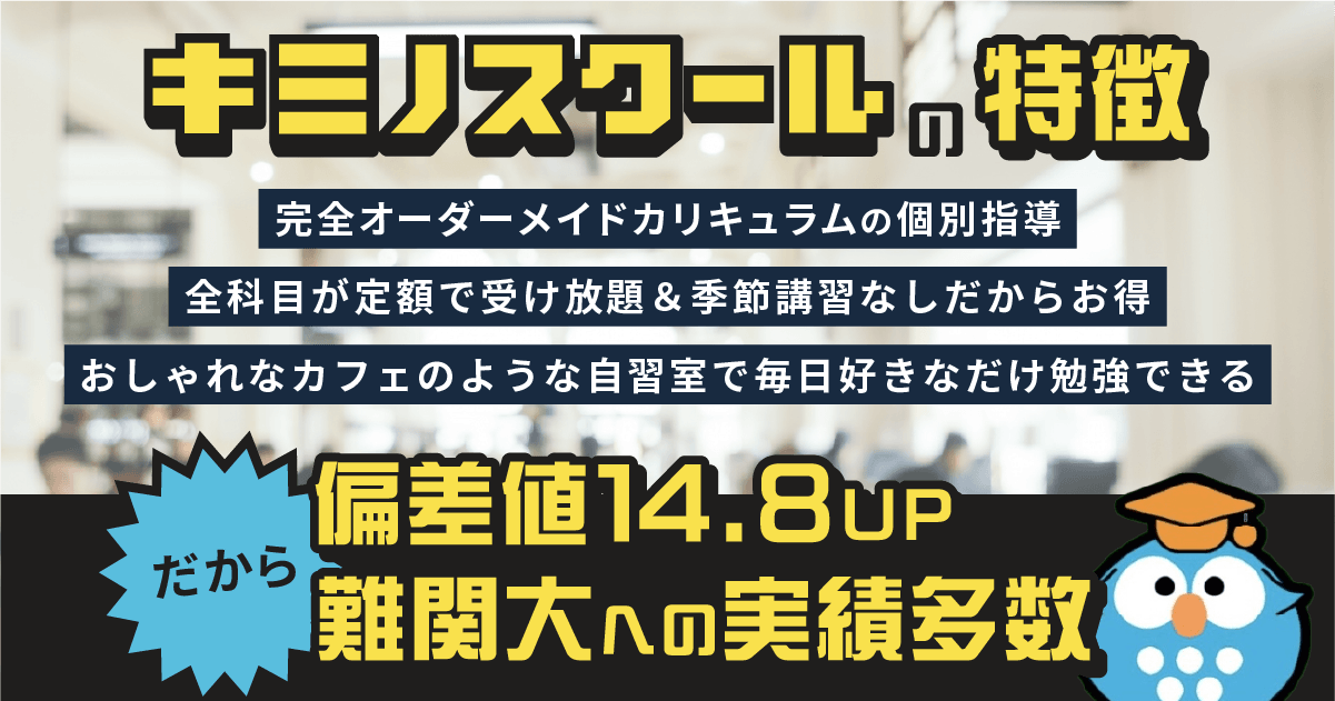 着実に成績を上げて難関大学への進学を目指すなら、偏差値平均14.8アップの実績がある「キミノスクール」がおすすめです。