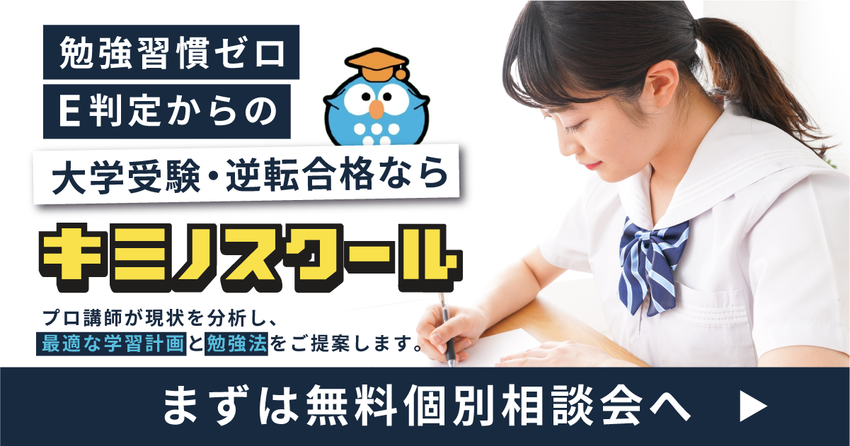 本気で成績を伸ばしたいなら、偏差値平均14.8%アップの実績を誇る「キミノスクール」がおすすめです。難関大出身講師のマンツーマン指導とオーダーメイドカリキュラムによって、短期間で成績アップが目指せます。