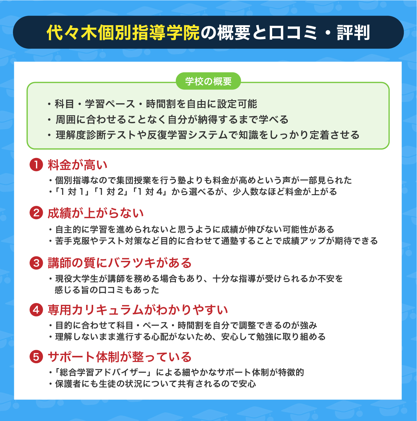 ここでは、代々木個別指導学院の口コミ・評判を5つ紹介します。
